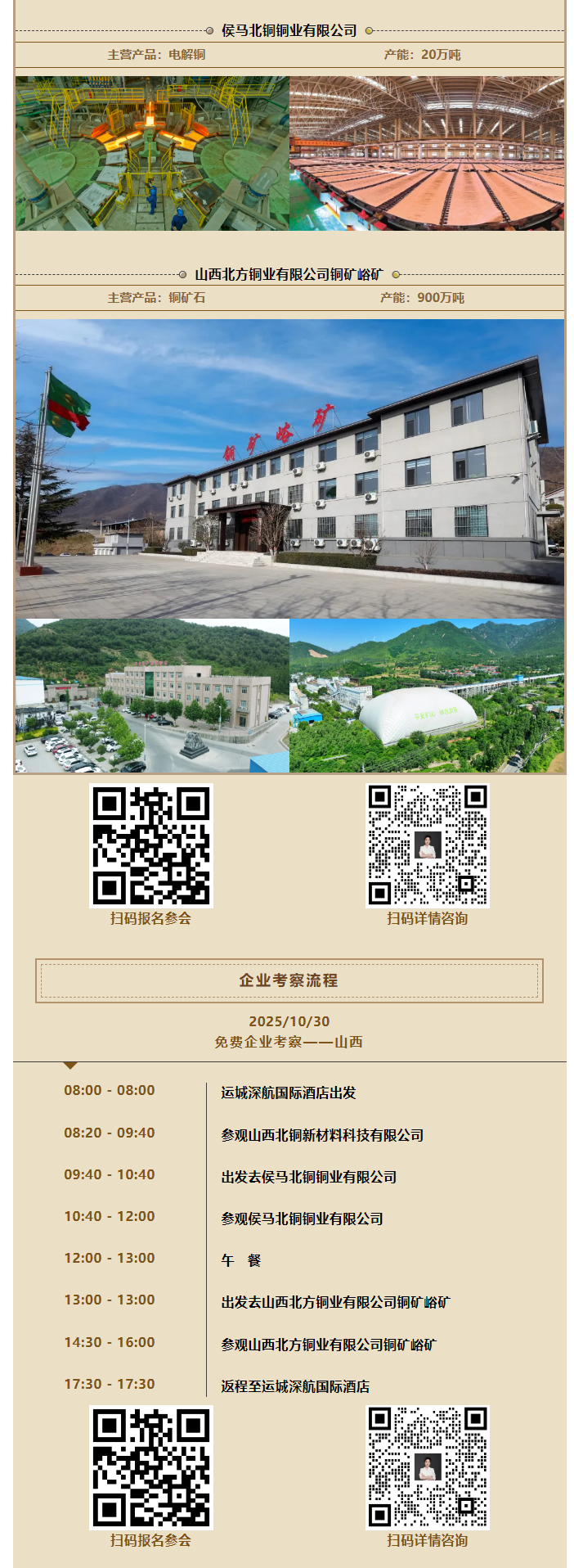会议论坛结束后,SMM将组织于10月30日免费参观考察山西铜产业链标杆企业!通过实地走访,您将深入了解企业的产能规模、工艺水平和品控体系,为后续合作搭建可靠的信任桥梁。