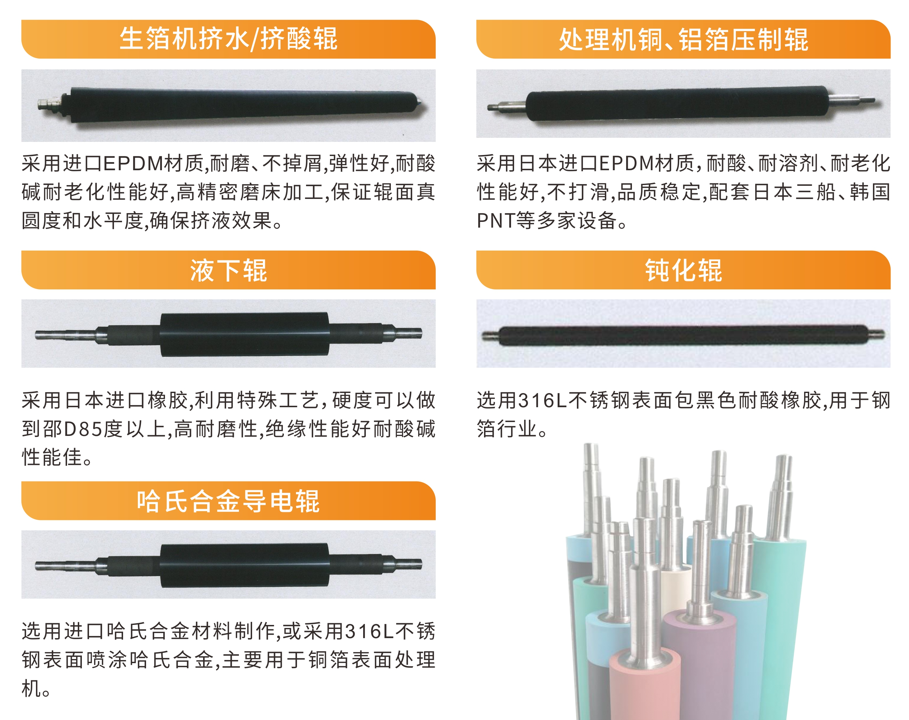 印刷压辊、涂布压辊、复合压辊、递墨辊、静电吸墨辊、导电胶辊、粘尘辊、牵引辊、分切机胶辊、套筒胶辊、无溶剂复合胶辊、流延覆膜胶辊、壁纸机或PVC压花辊、皮革压纹辊、烫金辊、镭射辊、水辊、墨辊(UV)、印染胶辊、冶金胶辊、挤水辊、传输辊等,同时还可以生产耐磨、耐高温、耐油、耐酸、耐碱、耐有机溶剂等各种胶垫及特种胶辊。