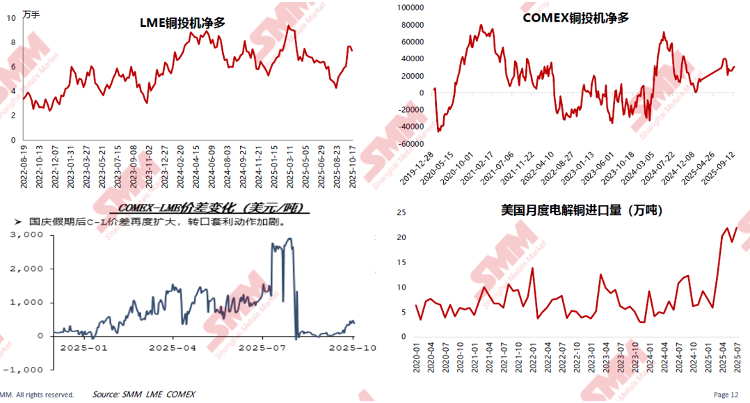 9月特朗普政府关税政策正式落地后,市场发现电解铜并未被纳入加税清单,加税范围仅覆盖铜加工材(如电信电缆、漆包线等)。这一结果虽超出部分市场预期,但并未扭转铜价上涨势头——核心原因在于跨市价差带来的套利空间依然可观,南美、非洲等地区的铜资源发往美国仍能获得高昂利润。与此同时,美国市场对铜价的远期乐观预期推动COMEX市场呈现大幅升水结构,对于持仓者而言,通过持有仓单获取的升水收益甚至超过现货销售利润,进一步刺激了资源向美国的聚集。