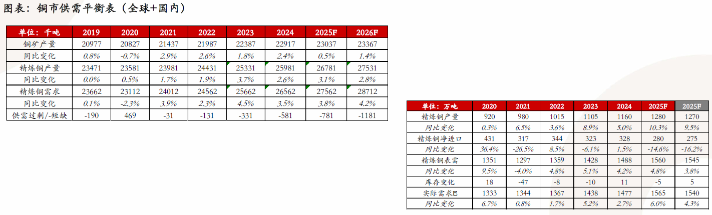 •供需平衡表:2022-2026年全球铜供需正在经历“弱短缺-缺口扩大-缺口扩大-缺口缩小-缺口扩大”。